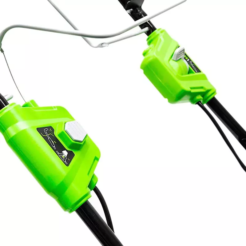 Высота стрижки настраивается при помощи 7-ступенчатого рычага. Вы найдете регулятор у заднего колеса, поэтому если понадобится изменить положение ножа, то не придется обходить самоходную газонокосилку Greenworks GD40LM46SP.