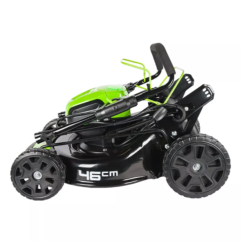 - Газонокосилка имеет ширину скашивания 46 см, обладает функцией мульчирования, сбора травы в травосборник, а также боковой выброс травы.