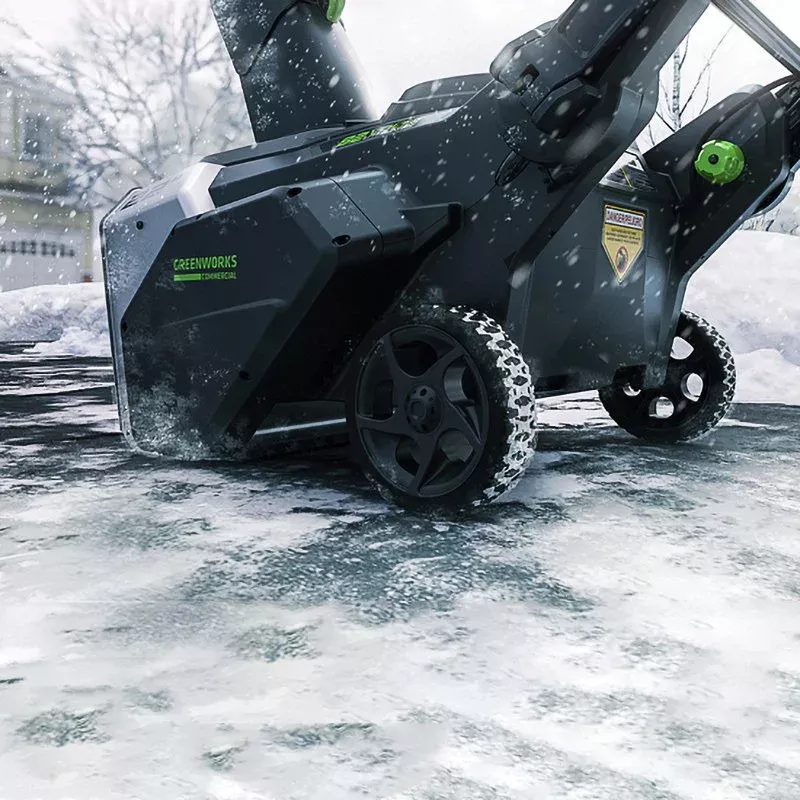 Аккумуляторный снегоуборщик GreenWorks GD82 оборудован мягким шнеком, который не царапает землю во время работы, благодаря чему вы можете его использовать на декоративных покрытиях. За один проход лопасти захватывают сугробы глубиной до 33 см и направляют их в желоб со скоростью до 1800 об/мин.
