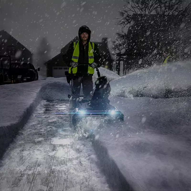 Снегоотбрасыватель GreenWorks GD82 оборудован быстроскладываемой рукояткой, которая экономит место при хранении или перевозке инструмента. Удобная ручка для транспортировки упрощает перемещение прибора. Светодиодные фары расположены на лицевой части ковша, они обеспечивают хорошую видимость при любых погодных условиях.