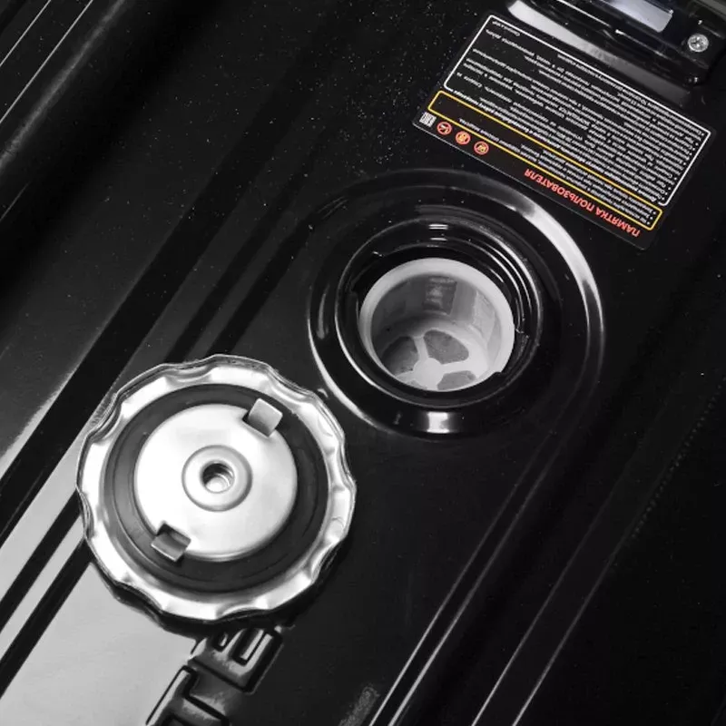 Благодаря расходу 3,2 л/ч, бензиновый генератор работает около 8 ч без дозаправки. На корпусе емкости расположена шкала-индикатор уровня топлива.
