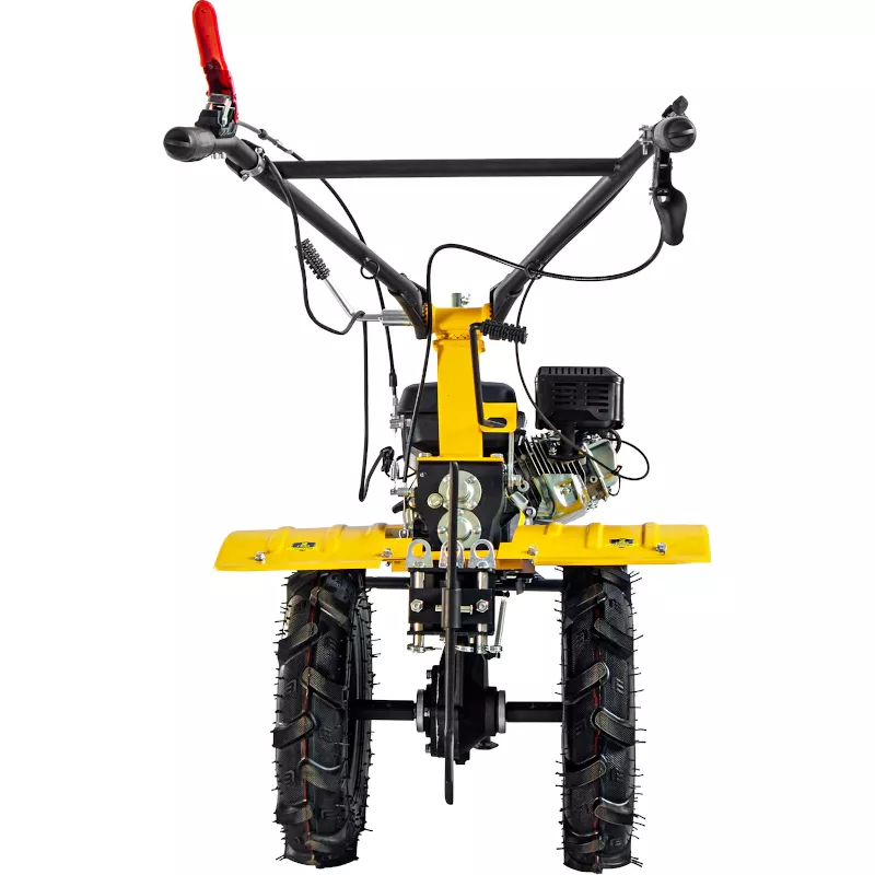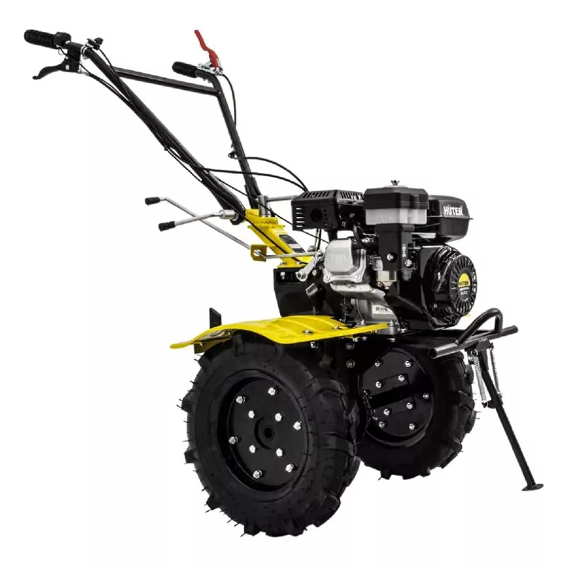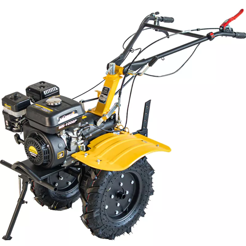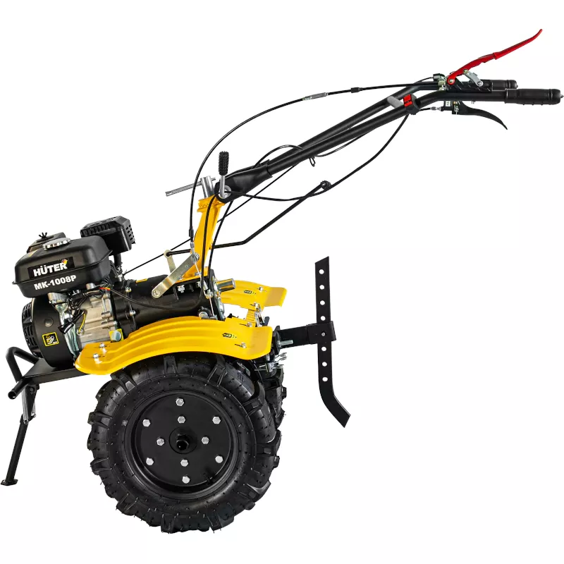 Хорошую проходимость и манёвренность HUTER МК-1008Р обеспечивает наличие трех передач – две вперёд и одна назад, а также широкие резиновые колёса 4х10 с глубоким, агрессивным протектором. Всё это позволяет мотокультиватору уверенно продвигаться по влажной земле и рыхлому грунту. Машина имеет удобную систему управления с переключателями на ручках агрегата. Защита пользователя обеспечена специальным щитком.
