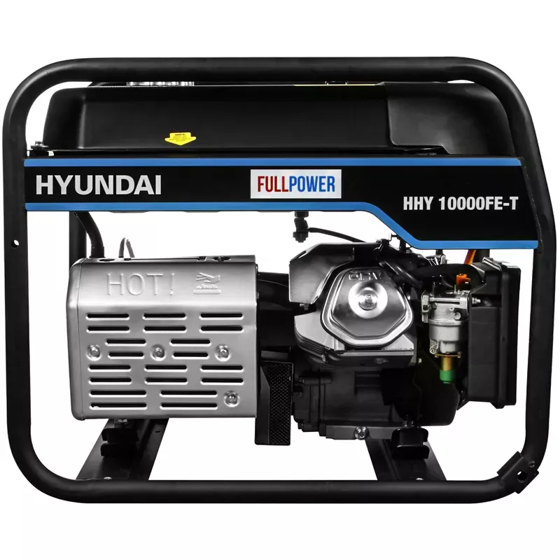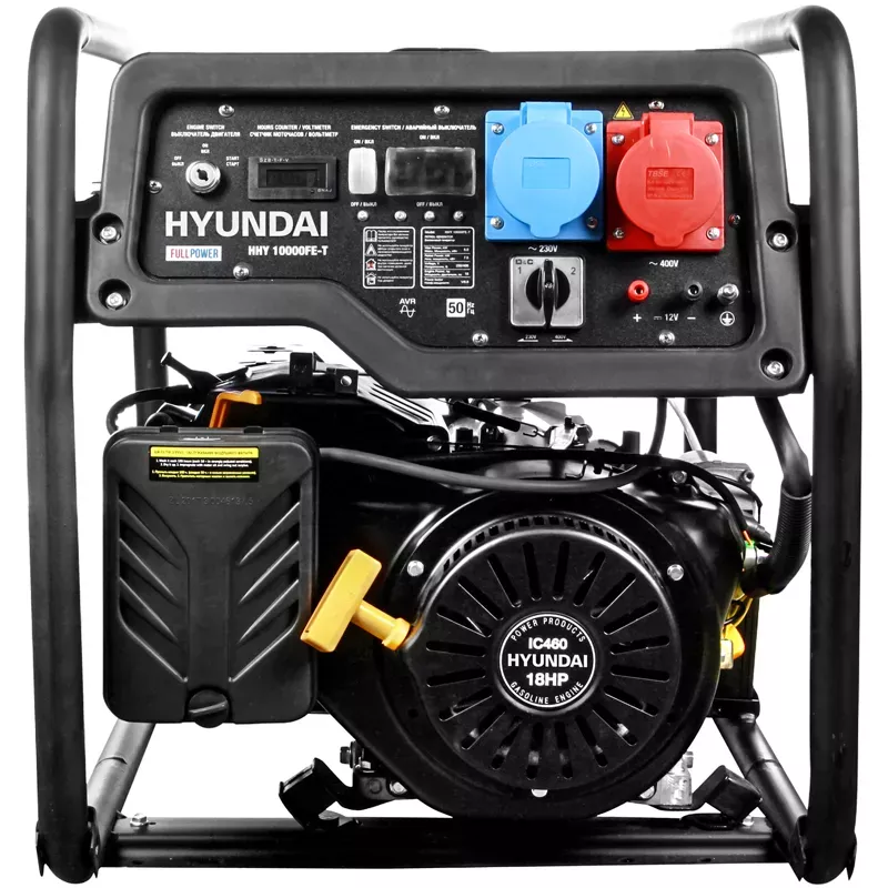 Новый дизайн электрогенератор Hyundai HHY 10000FE-T включает в себя удобное расположение всех основных органов управления. Для экстренной остановки двигателя бензогенератора на его передней панели расположены два аварийных выключателя для однофазной и многофазной розетки.