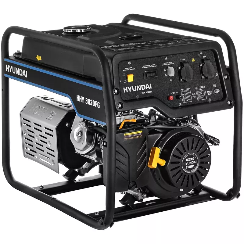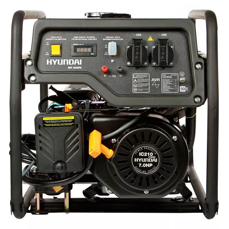 На панели управления газо-бензинового генератора Hyundai HHY 3020FG установлен цифровой дисплей, отображающий выходное напряжение и количество отработанных моточасов. Две розетки на 16 А оборудованы самозакрывающимися крышками, которые защищают контакты от грязи и пыли. Выход постоянного тока на 12 В позволяет заряжать аккумуляторную батарею.
