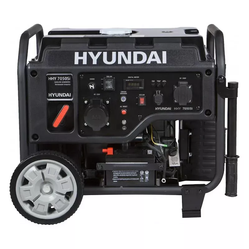 Инверторный генератор Hyundai HHY 7050Si номинальной мощностью 5 кВт вырабатывает качественный ток со стабильной синусоидой, что позволяет использовать его в качестве резервной электростанции для загородного дома, питания котлов отопления и высокоточных приборов. Устройство оснащено четырехтактным бензиновым двигателем мощностью 9,5 л.с., вместительным топливным баком и колесами для перевозки. Температура эксплуатации: от -5°С до +35°С.