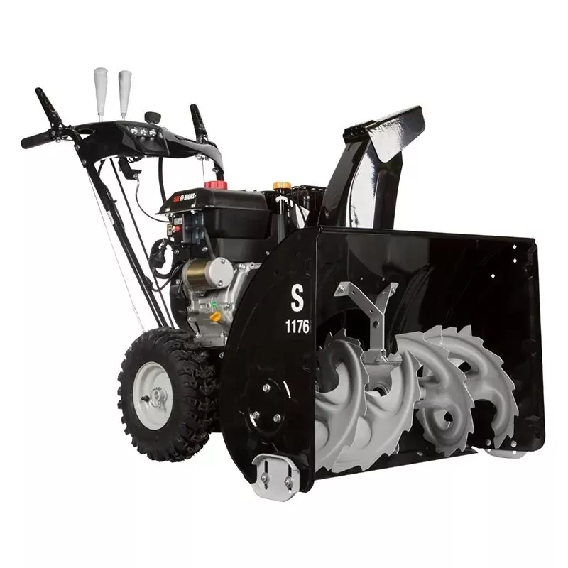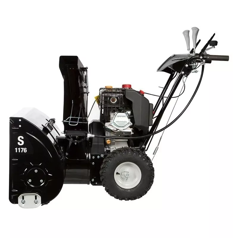 Ширина уборки снега за один проход – 76 см, высота – 51 см. Удобная система управления позволяет настраивать скорость движения инструмента, а также направление и дальность выброса. Заборный ковш из двухмиллиметровой стали оснащен ножом для снятия остаточного слоя снега и лыжами для лучшего скольжения.