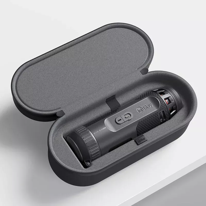 Монокуляр iRay xEye 3 E3 Max поставляется в герметичной транспортировочной сумке на молнии с двумя отделениями для аксессуаров: проводов, магнитной зарядки, дополнительного чехла, двух ремешков для переноски на шее и запястье. Блок питания подходит под бытовые розетки.