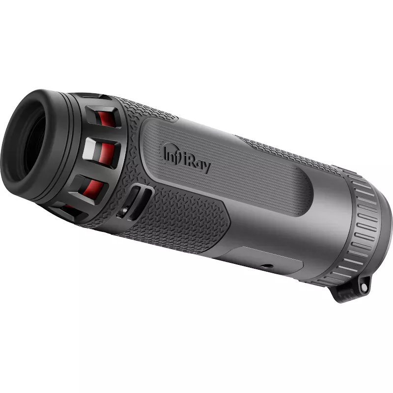 Устройство не имеет отдельной кнопки включения питания. Прибор автоматически включается при снятии крышки объектива. Узкий корпус с нескользящей рельефной поверхностью удобно лежит в руке. Большой кнопкой управления фото- и видеосъемкой легко пользоваться в темноте на ощупь. Удобное ребристое колесико используется для доступа к меню и функциям тепловизионного монокуляра iRay. Поворотное кольцо ручной фокусировки позволяет быстро навести резкость.