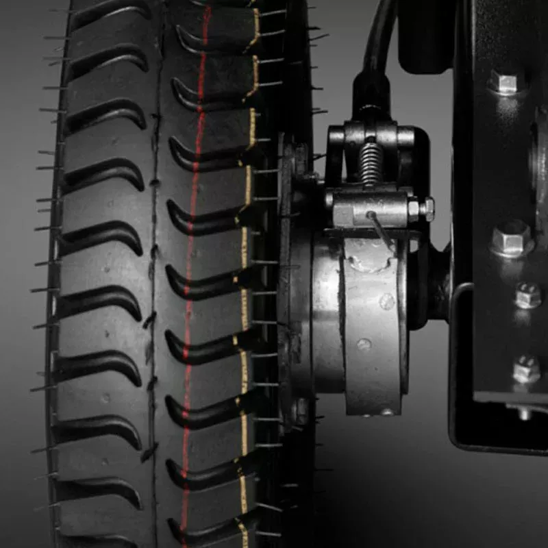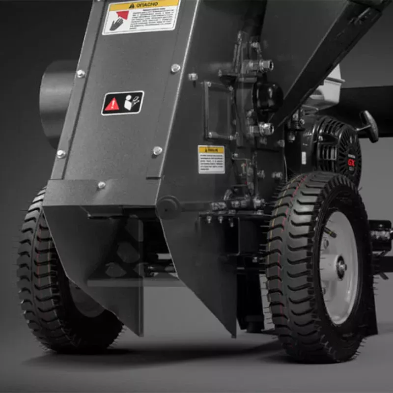 Большие 14-дюймовые колеса на подшипниках, удобная рукоятка ручного перемещения, буксирная сцепка для транспортировки по участку при помощи садового трактора, райдера и т.п. Рычаг стояночного тормоза позволяет предотвратить случайное движение агрегата.
