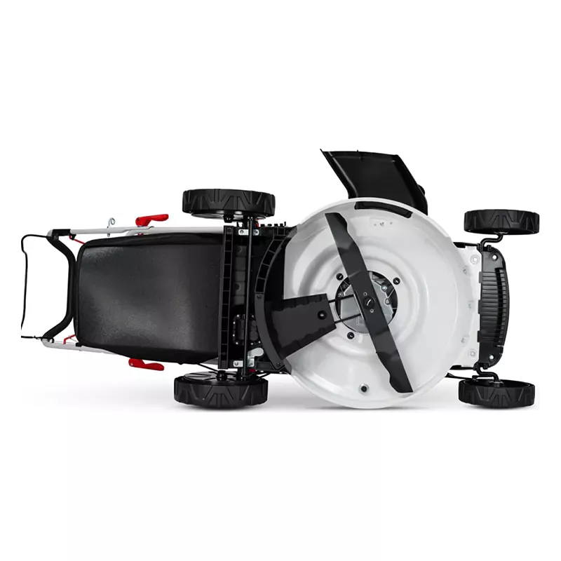 Бензиновая газонокосилка поддерживает несколько режимов работы. Скошенная трава либо собирается в травосборник, либо выбрасывается обратно на газон через боковой или задний разгрузочный лоток, либо мульчируется для удобрения почвы. Семиуровневая регулировка высоты кошения выполняется при помощи рычага около заднего колеса. Косилка движется самостоятельно с постоянной скоростью. Достаточно лишь задать направление. В труднопроходимых местах привод можно отключить, отпустив соответствующий прижимной рычаг. На рукоятке предусмотрен специальный держатель для шнура стартера, избавляющий от необходимости наклоняться вперед при запуске двигателя.