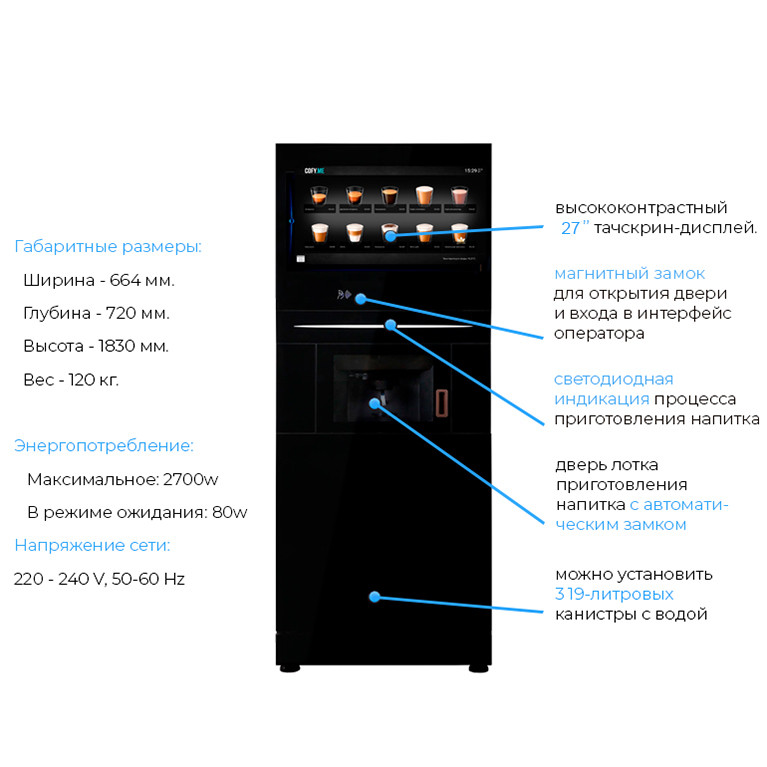 - Большой сенсорный дисплей 27'' c 20+ напитками на любой вкус