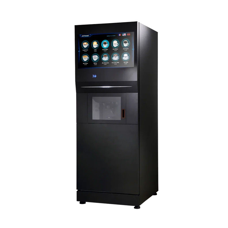 Jetinno JL500 — это новый кофейный автомат, отличающийся стильным дизайном, широким ассортиментом напитков (более 20), большим сенсорным экраном, функцией автоматической очистки и простотой в использовании. Он идеально подходит для офисного применения и уже пользуется спросом у клиентов из разных стран. Оснащен встроенным диспенсером стаканов формата «кофе с собой» – диаметром 80 или 90 мм и объемом от 200 до 400 мл. и возможностью оснащения диспансером крышек с функцией автоматического закрывания крышкой стакана. Выбор напитков – с помощью 27” тачскрин-дисплея.