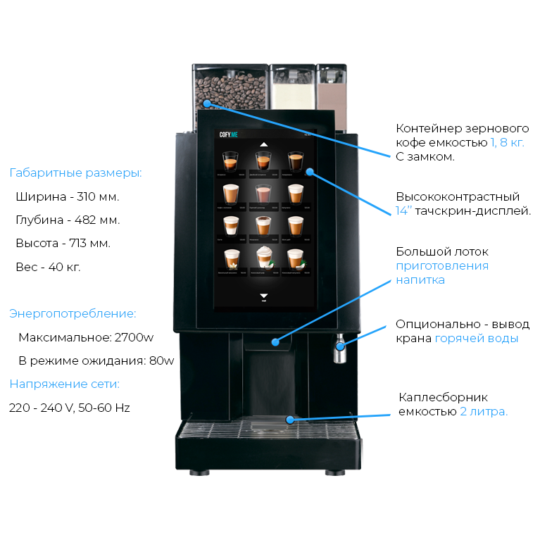 - Позволяет в автономном режиме приготовить более 150 напитков без пополнения бункеров