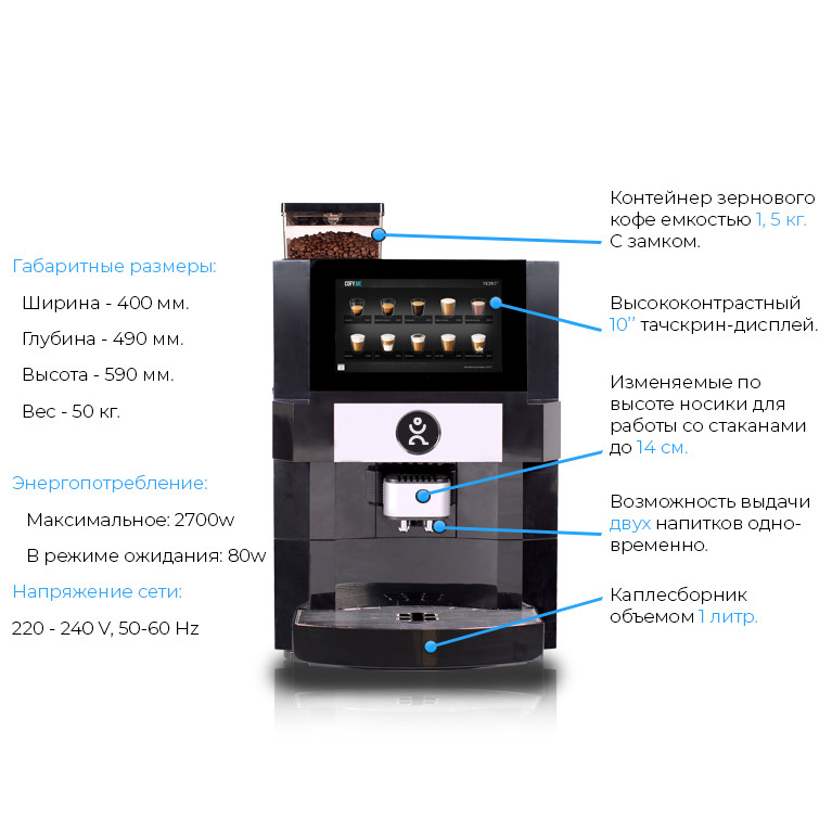 - Изменяемая высота раздаточной группы для работы со стаканами высотой от 7 до 14 см. Возможность приготовления двух напитков эспрессо в две чашки одновременно