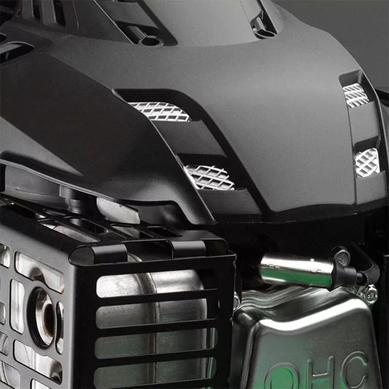 В случае столкновения бензиновой газонокосилки с камнем, арматурой или другим твердым предметом ножи складываются, смягчая нагрузку на вал. Изготовленные из высокопрочной толстой стали элементы кожуха и режущей системы рассчитаны на интенсивную эксплуатацию.