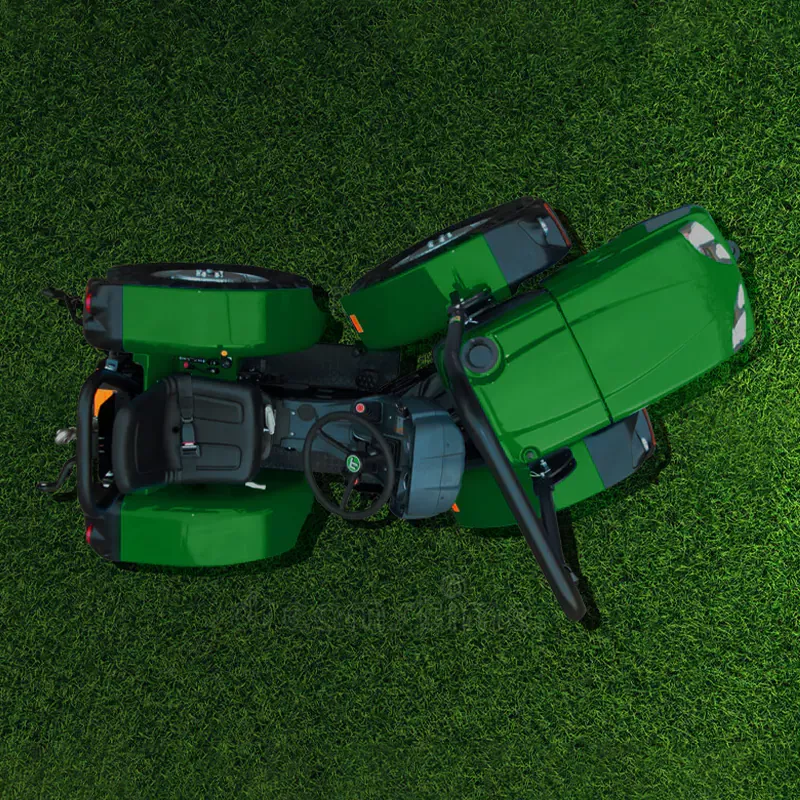 Косилку легко разворачивать на 360 градусов. Это повышает ее маневренность. Большие пневматические колеса без проблем преодолевают кочки и препятствия на неровных участках.