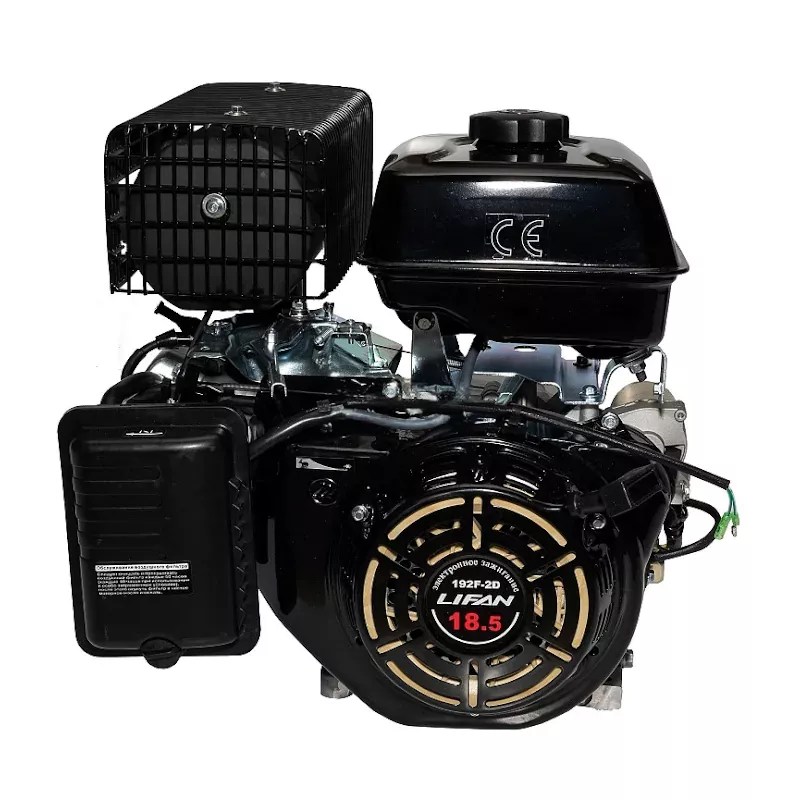 Бензиновый двигатель Lifan 192 F-2-R разработан для установки на мототехнику различного уровня. Двигатель хорошо подходит для установки на культиваторы и мотоблоки, мотобуксировщики, мотопомпы, генераторы и другую технику. Эта модель сочетает в себе долговечность, экономичность с умеренной стоимостью и простотой в использовании. Наличие понижающего редуктора позволяет расширить область применения двигателя. Это четырехтактный одноцилиндровый двигатель внутреннего сгорания. Рабочий объем цилиндра составляет 445 кубических сантиметров, номинальная мощность достигает 14,6 лошадиных сил, а максимальная может достигать 18.5 лошадиных сил. Диаметр цилиндра и тип газораспределительного механизма позволяют обеспечить компактные размеры двигателя, он свободно устанавливается на многие модели малой сельскохозяйственной техники. В качестве топлива эта модель использует широко распространенный автомобильный бензин марки АИ-92, потому проблем с горючим не возникнет. Коленчатый вал имеет горизонтальное расположение, это также способствует небольшим размерам, а кроме того существенно упрощает конструкцию и монтаж силового агрегата на шасси. Крутящий момент достигает 51 Н.м при 1500 оборотов в минуту, при этом сохраняется высокая стабильность работы и небольшой расход бензина. Емкость топливного бачка равна 6,5 литрам, одной заправки достаточно для длительной непрерывной работы. В качестве смазки используется доступное и известное каждому автомобилисту моторное масло 10х30, 10х40 для одной заправки маслом требуется не более 1,1 литра. Транзисторная система зажигания проста в обслуживании и долговечна, она способствует стабильной работе двигателя при любых условиях. Двигатель Lifan 192 F-2-R обладает массой в 36 килограмм, это легковесный и компактный агрегат, он способен обеспечить высокую продуктивность работы при минимальных затратах и потерях. Его простая конструкция не создаст проблем при установке или при обслуживании, использование эффективного воздушного охлаждения позволяет активно использовать мотор даже в жаркую погоду, удобный пусковой тросик обеспечивает легкий запуск двигателя.