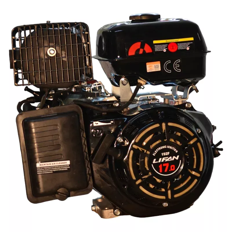 Бензиновый двигатель Lifan 192 F- R разработан для установки на мототехнику различного уровня. Двигатель хорошо подходит для установки на культиваторы и мотоблоки, мотобуксировщики, мотопомпы, генераторы и другую технику. Эта модель сочетает в себе долговечность, экономичность с умеренной стоимостью и простотой в использовании. Наличие понижающего редуктора позволяет расширить область применения двигателя. Это четырехтактный одноцилиндровый двигатель внутреннего сгорания. Рабочий объем цилиндра составляет 445 кубических сантиметров, номинальная мощность достигает 13,6 лошадиных сил, а максимальная может достигать 17 лошадиных сил. Диаметр цилиндра и тип газораспределительного механизма позволяют обеспечить компактные размеры двигателя, он свободно устанавливается на многие модели малой сельскохозяйственной техники. В качестве топлива эта модель использует широко распространенный автомобильный бензин марки АИ-92, потому проблем с горючим не возникнет. Коленчатый вал имеет горизонтальное расположение, это также способствует небольшим размерам, а кроме того существенно упрощает конструкцию и монтаж силового агрегата на шасси. Крутящий момент достигает 51 Н.м при 1500 оборотов в минуту, при этом сохраняется высокая стабильность работы и небольшой расход бензина. Емкость топливного бачка равна 6,5 литрам, одной заправки достаточно для длительной непрерывной работы. В качестве смазки используется доступное и известное каждому автомобилисту моторное масло 10х30, 10х40 для одной заправки маслом требуется не более 1,1 литра. Транзисторная система зажигания проста в обслуживании и долговечна, она способствует стабильной работе двигателя при любых условиях. Двигатель Lifan 192 F-R обладает массой в 36 килограмм, это легковесный и компактный агрегат, он способен обеспечить высокую продуктивность работы при минимальных затратах и потерях. Его простая конструкция не создаст проблем при установке или при обслуживании, использование эффективного воздушного охлаждения позволяет активно использовать мотор даже в жаркую погоду, удобный пусковой тросик обеспечивает легкий запуск двигателя.