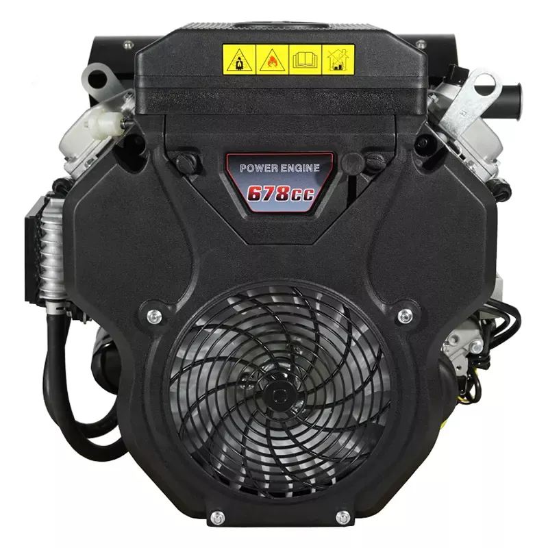 Двухцилиндровый двигатель, объем 678 куб.см, 24 л.с, горизонтальный вал конусный 3:16, электрический запуск, катушка освещения 0.8А.