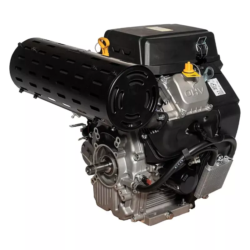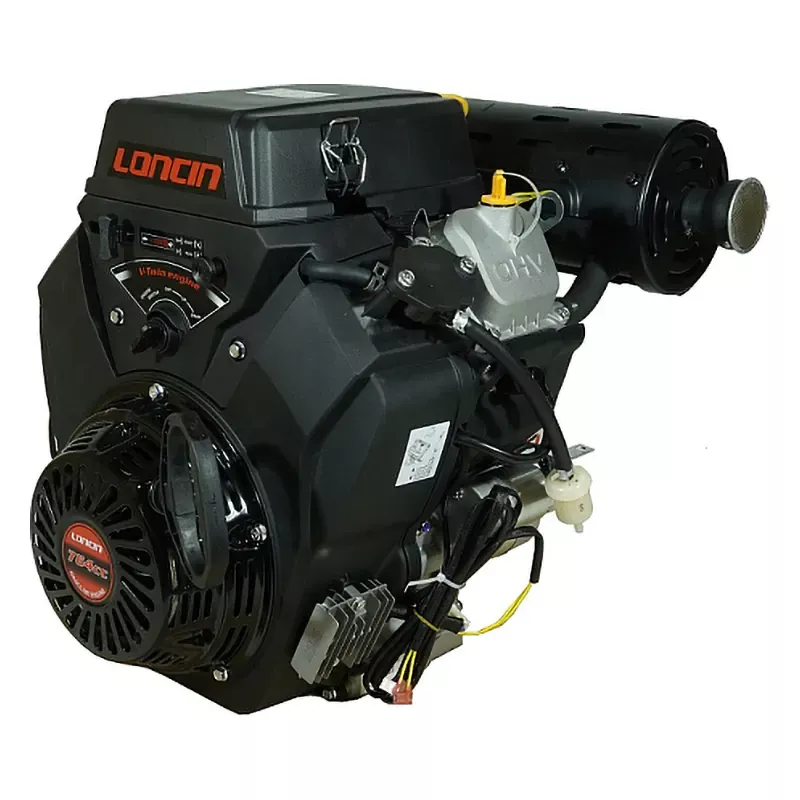 Двигатель Loncin LC2V80FD с V-образным расположением цилиндров не занимает много места на технике. Такая компоновка удобна также для последующего технического обслуживания мотора. Принудительная система смазки обеспечивает эффективную работу внутренних узлов. Для защиты масляной системы от перегрева предусмотрен внешний радиатор. При недостатке масла в картере двигатель автоматически остановится во избежание поломок, для чего имеется специальный датчик. Передача крутящего момента от двигателя к навесному оборудованию осуществляется через горизонтальный вал диаметром 25 мм.