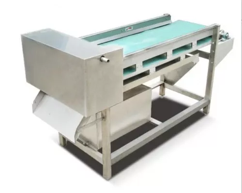 На траспортную ленту идет постоянная подача продукта, по траспортеру продукт попадает на дисковые ножи, где и происходит нарезка.