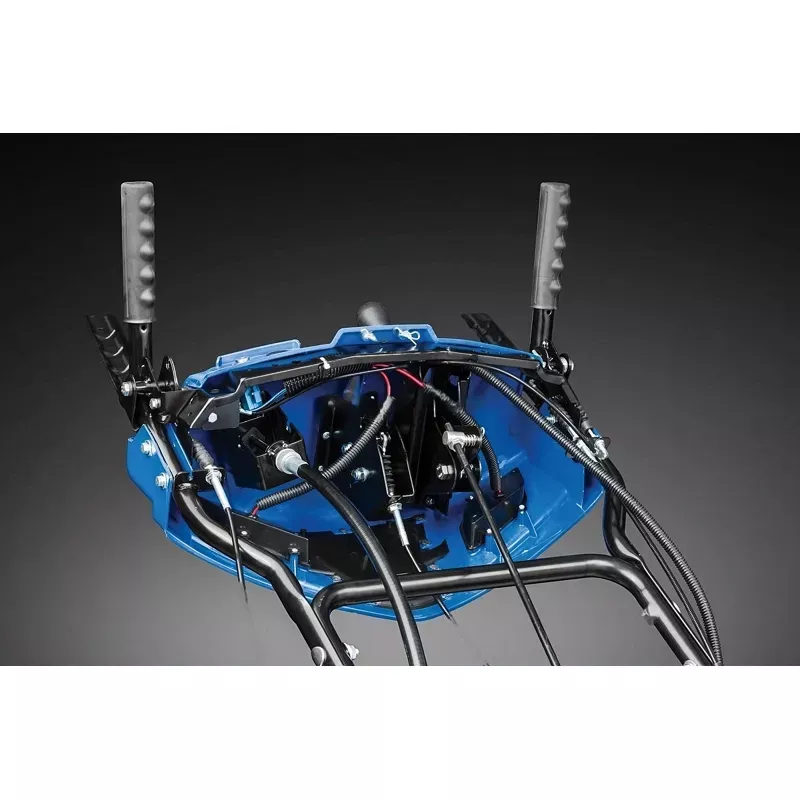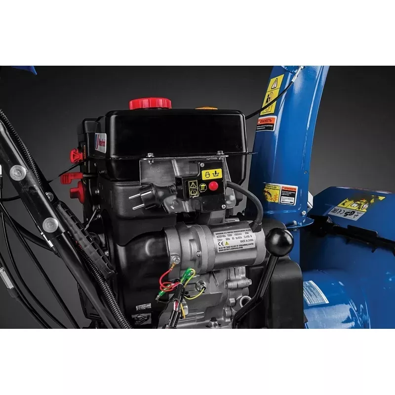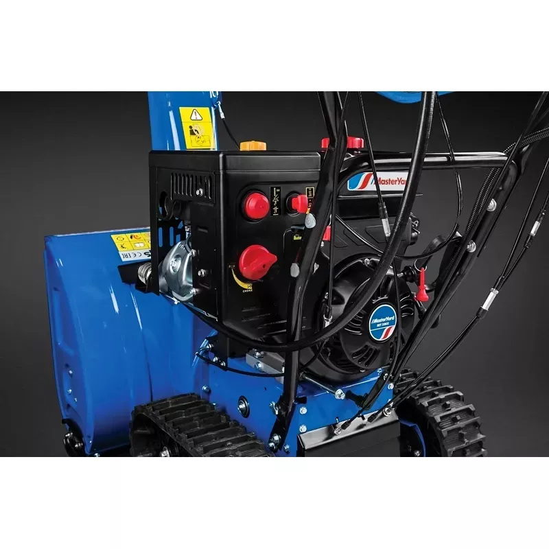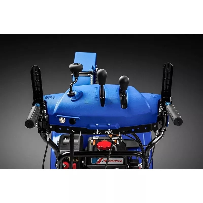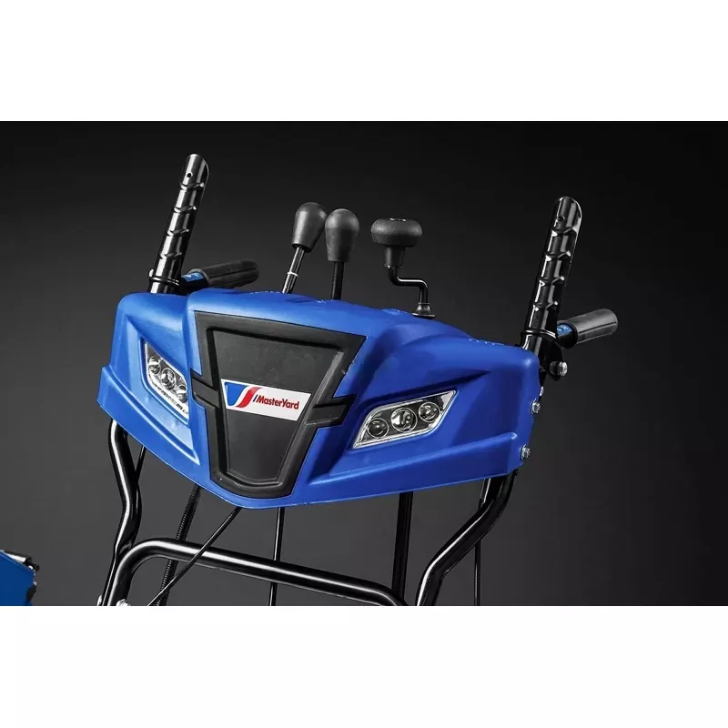 Бензиновый снегоуборщик MasterYard MV 26530 RET - гусеничная модель с электрическим запуском и шириной захвата 70 см. Машина оснащается двойной яркой фарой, системой быстрого разворота желоба выброса, обогревом рукояток.