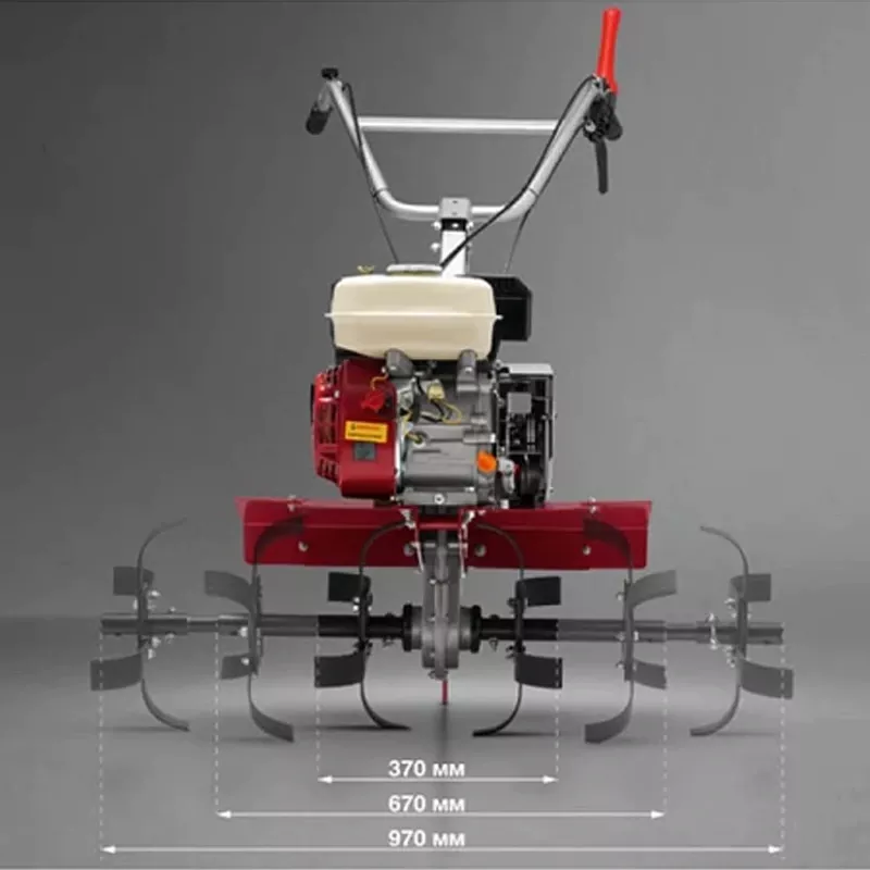 На бензиновый культиватор Мобил К МКМ-1Р ПРО можно устанавливать от 2 до 6 фрез. Их количество определяет ширину обработки: 37, 67 или 97 см. При наличии дисков для защиты растений данные значения повышаются до 45, 75, 105 см.