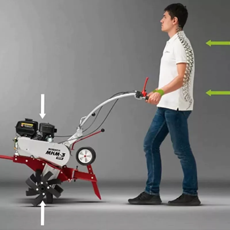 Ручка сцепления бензинового мотокультиватора не нагружает запястье. А технология Minimum Vibration Effect обеспечивает низкий уровень вибраций. Это возможно за счет руля, который крепится к редуктору, а не к раме. Роль также играют и антивибрационные вставки, которые снижают колебания до 50 %.