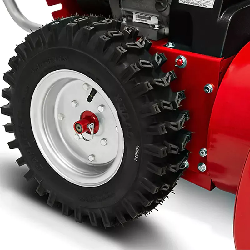 Бензиновый снегоочиститель оснащен большими колесами X-TRAC, которые обеспечивают плавный ход даже по небольшим ямам или неровностям. Агрессивный протектор гарантирует хорошее сцепление как с рыхлым снегом, так и с обледеневшей поверхностью. Каждое колесо выдерживает вес в 200 кг. Диски изготовлены из цельноштампованной стали. Это обеспечивает длительный срок эксплуатации модели даже при больших нагрузках.