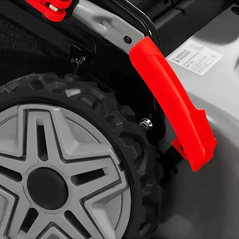 Дополнительно агрегат имеет функцию бокового выброса и мульчирования растительной срезки. Все органы управления техникой удобно сосредоточены на рукоятке. В транспортном положении или во время хранения косилки ручку можно складывать пополам, уменьшая габариты машины. Во время работы газонокосилка производит совсем немного шума и вибрации.
