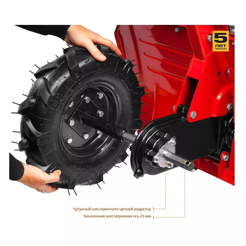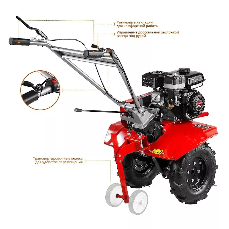 Отдельно можно приобрести плуг, снегоочиститель, щетку, лопату, фронтальную косилку, тележку и другое оборудование. Аксессуары крепятся к мотоблоку и расширяют его функционал.