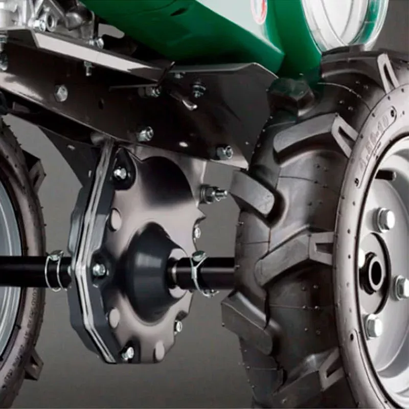 Оправа главного подшипника бензинового мотоблока смонтирована заподлицо, благодаря чему снижается риск ее деформации и увеличивается срок службы всего механизма. Расширенная конструкция охлаждающих рёбер и автоматическая система подачи масла обеспечивают необходимое охлаждение двигателя. Крупные шарикоподшипники, расположенные по обеим сторонам коленчатого вала, создают максимальную устойчивость инструмента при изменении нагрузки.
