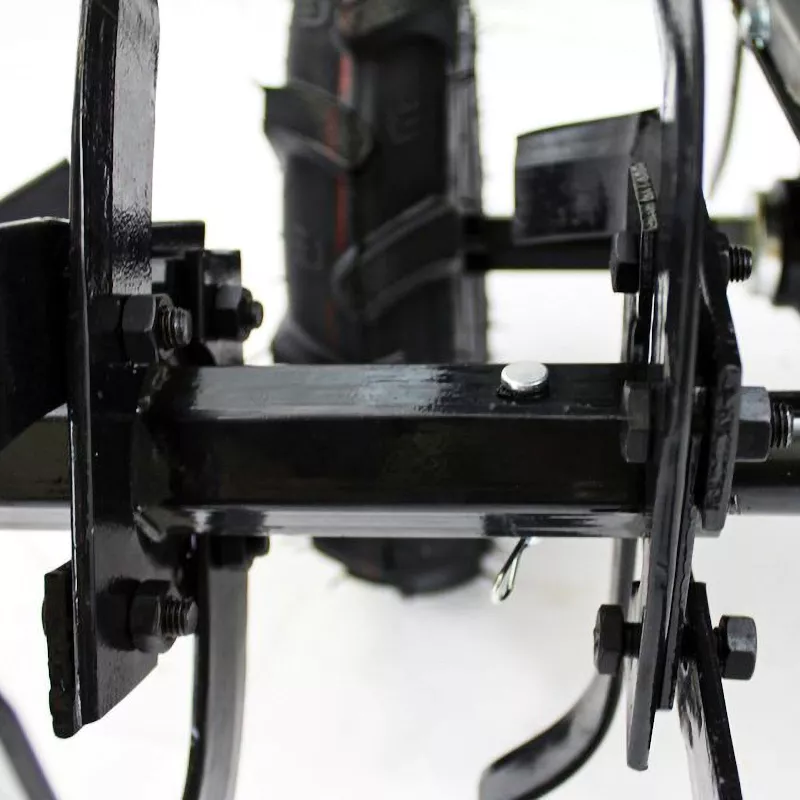 Чтобы настроить глубину погружения фрезы в землю, необходимо выставить соответствующее положение металлического сошника. Он крепится на сцепку с помощью стального пальца и шплинта, и регулируется без использования дополнительных инструментов. Защитные крылья предотвращают отбрасывание земли в вашу сторону во время вспахивания почвы.