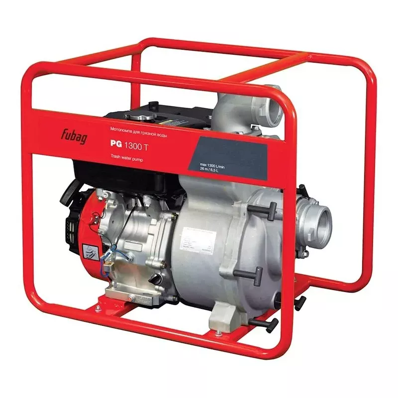 Мотопомпа для сильнозагрязненной воды Fubag PG 1300 T предназначена для откачки грязной воды из подвалов и строительных котлованов, работ в сельском хозяйстве, ликвидации последствий паводков и половодий. Мощный насос перекачивает сильнозагрязненную воду с примесями абразивных частиц до 25 мм. Максимальная высота всасывания равна 8 м, высота напора — 26 м. Производительность мотопомпы составляет 1300 л/мин.