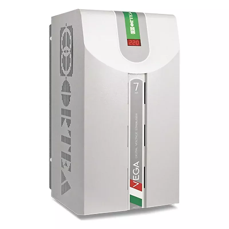 Стабилизатор напряжения ORTEA Vega 7 плавно выравнивает параметры сети в 2 режимах: до ± 15 и до ± 20 %. Модель исправно работает на морозе, имеет защиту от молний и большой гарантийный срок.