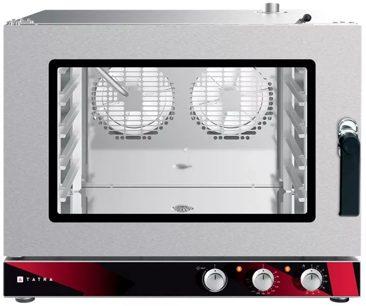 Пароконвектомат Tatra TC05M1L предназначен для использования на предприятиях общественного питания для приготовления различных блюд с применением режимов сочетания конвекции и пара. Фактически пароконвектомат может заменить собой несколько типов теплового оборудования, таких как конвекционная печь, жарочный шкаф, пароварка, плита и сковорода.