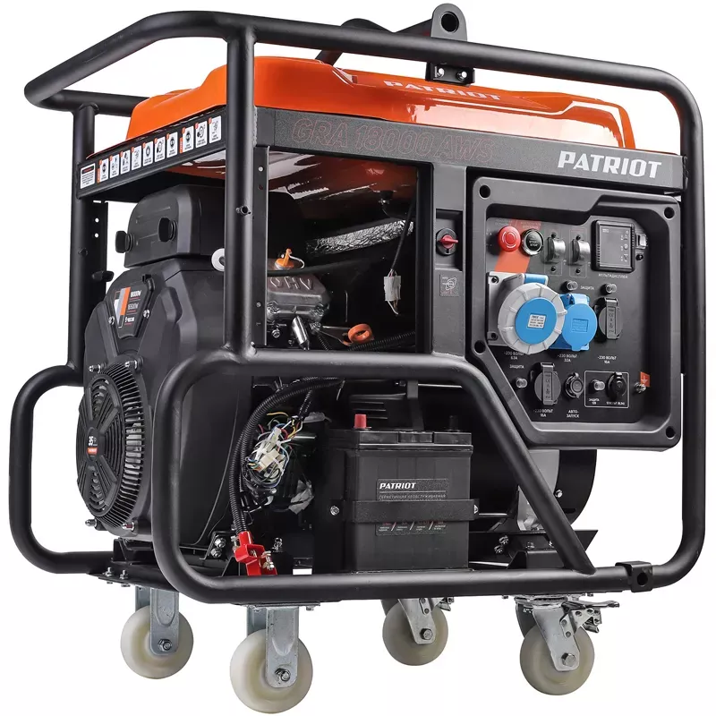 Бензиновый генератор PATRIOT GRA 18000 AWS способен обеспечить автономным питанием отдельный дом, небольшое предприятие, торговый объект или гостиницу в случае перебоев в электроснабжении. Устройство номинальной мощностью 16,5 кВт оснащено четырьмя розетками 220 В, в том числе силовой на 32 А и промышленной на 63 А, а также 12-вольтовым разъемом для подзарядки автомобильного аккумулятора. Для удобства перемещения электростанция оборудована ручками и колесами.