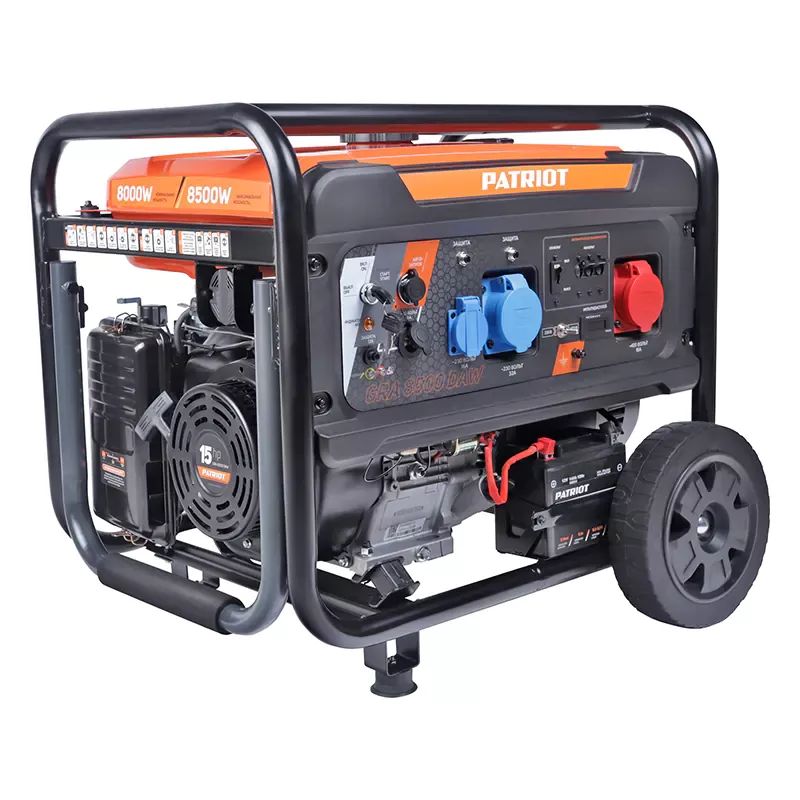 Бензиновый генератор PATRIOT GRA 8500DAW используется для резервного электроснабжения осветительных и бытовых приборов в коттедже или на даче, небольших станков и инструментов в мастерской. Номинальная мощность на выходе при выработке однофазного тока составляет 7,5 кВт, при выработке трехфазного — 8 кВт. Генератор имеет три розетки: бытовую 230 В/16 А и силовые 230 В/32 А, 400 В/16 А, а также выход постоянного тока 12 В.