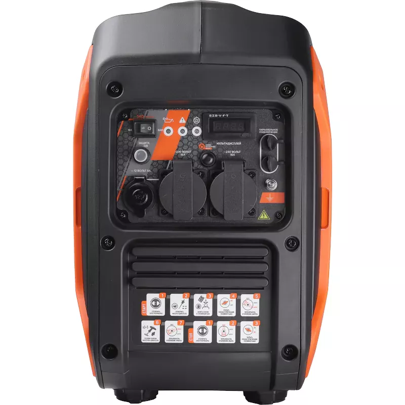 Инверторный генератор PATRIOT оснащен четырехтактным верхнеклапанным двигателем внутреннего сгорания объемом 79,7 см3 с воздушным охлаждением и ручным стартером. На мультидисплее 5 в 1 отображаются все параметры работы, включая напряжение, силу тока и отработанные моточасы. Зеленый индикатор сообщает, что на розетках есть напряжение, желтый — о недостатке моторного масла, а красный — о перегреве или перегрузке.