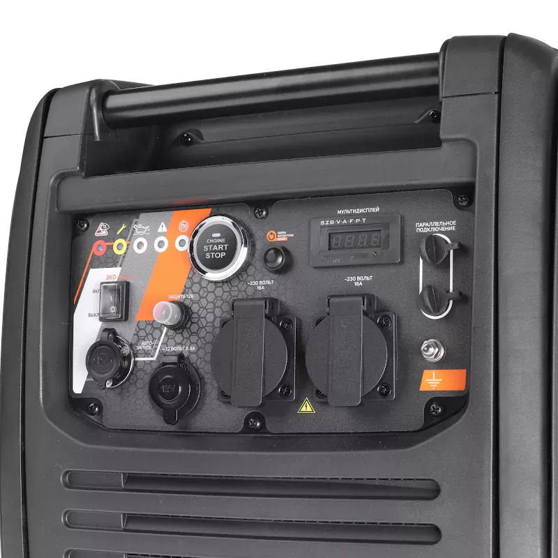Инверторный генератор PATRIOT оснащен четырехтактным верхнеклапанным двигателем внутреннего сгорания объемом 223 см3 с воздушным охлаждением. Кнопка запуска позволяет автоматически завести мотор одним нажатием. Для выключения генераторной установки достаточно нажать на эту кнопку еще раз. Аккумулятор для электростартера входит в комплект. С помощью мультидисплея 5 в 1 можно отслеживать текущее напряжение, силу тока, отработанные моточасы и другие параметры. Зеленый индикатор сообщает, что на розетках есть напряжение, желтый — о недостатке моторного масла, а красный — о перегреве или перегрузке.