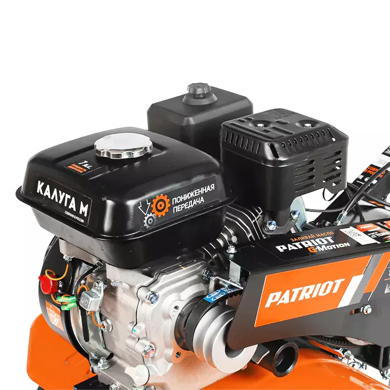 Мотоблок PATRIOT КАЛУГА М оснащен качественным, устойчивым к износу чугунным редуктором. Отсутствие швов позволяет избежать протечки масла. Специальный кожух защищает редуктор от попадания внутрь камней и грязи.