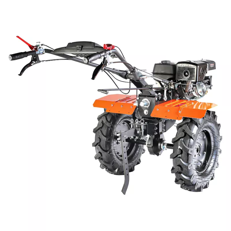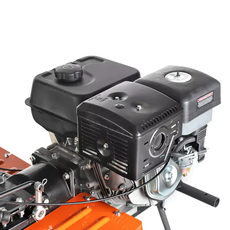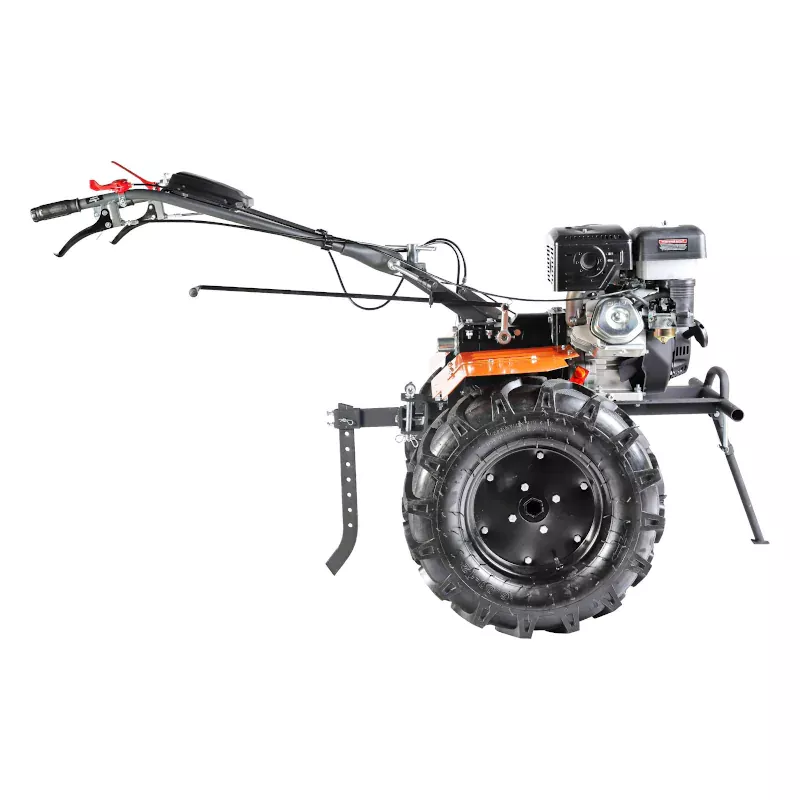 Бензиновый мотоблок рассчитан на высокие нагрузки, а потому имеет прочную конструкциею: многодисковое сцепление в масляной ванне, шестеренчатый чугунный редуктор, надежный 4-тактный двигатель, а также усиленную раму со сцепкой.