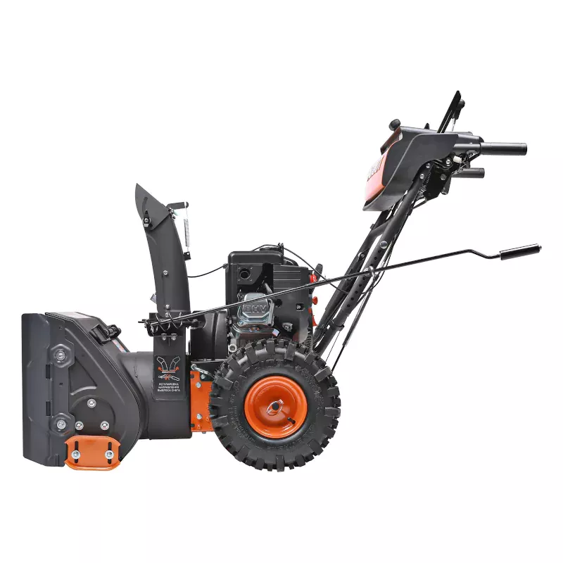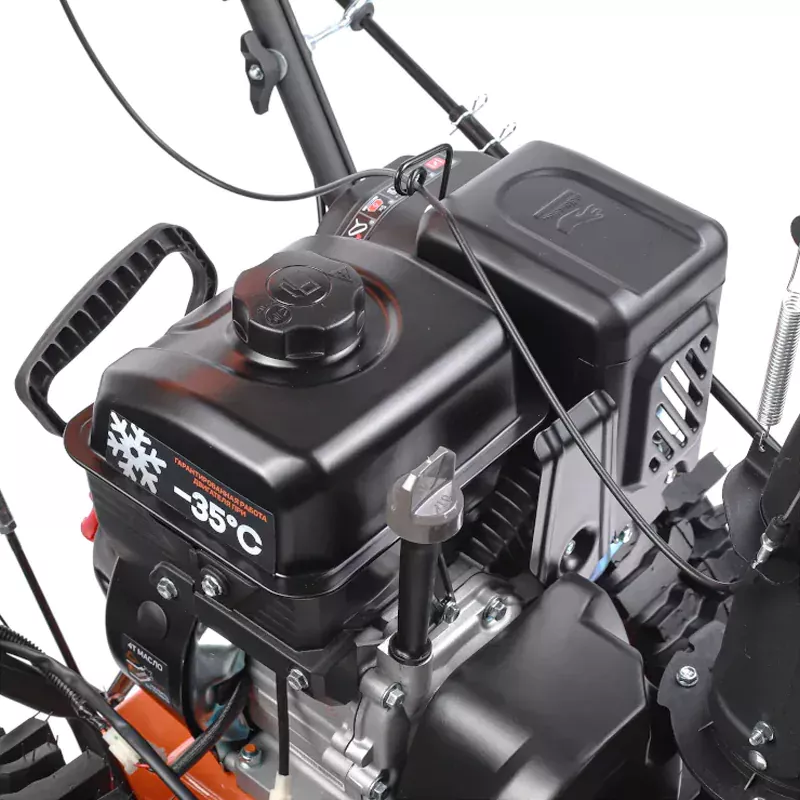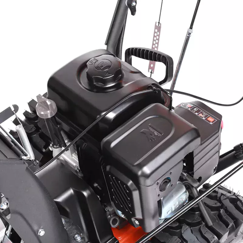 Все элементы управления расположены на операторской панели. Благодаря этому вы можете настраивать работу снегоуборочной машины одной рукой. Например, задавать скорость движения или регулировать дальность выброса снега. Снегоуборщик движется за счет трансмиссии, поэтому уборка территории не потребует от вас много сил. На ваш выбор есть 6 скоростей вперед и 2 назад.