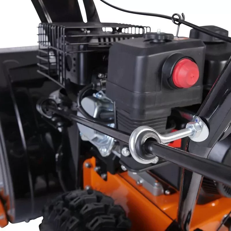 Самоходный снегоуборщик предназначен для быстрой очистки территории от высоких и плотных сугробов. Усиленный металлический ковш выдерживает большие нагрузки, он оснащен опорными лыжами, которые позволяют регулировать подъем шнека. Если вы используете машину на неровной поверхности, рекомендуется установить максимальный зазор между землей и заборным механизмом.