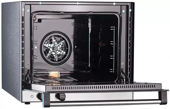 Термообработка продуктов осуществляется за счет равномерной циркуляции горячего воздуха внутри рабочей камеры.