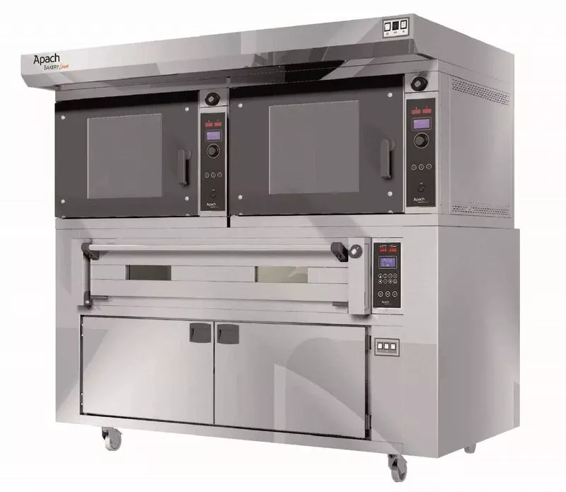Печь конвекционная электрическая Apach Bakery Line 2K5P60P DP+E4L18PA DPBI-T без соед. комплекта с подом, с расстойкой - печь для хлебопекарных и кондитерских изделий. Предназначена для выпекания или разогрева кондитерских и хлебобулочных изделий, различных блюд, замороженных или предварительно выдержанных в расстоечном шкафу заготовок из теста на предприятиях общественного питания и торговли.