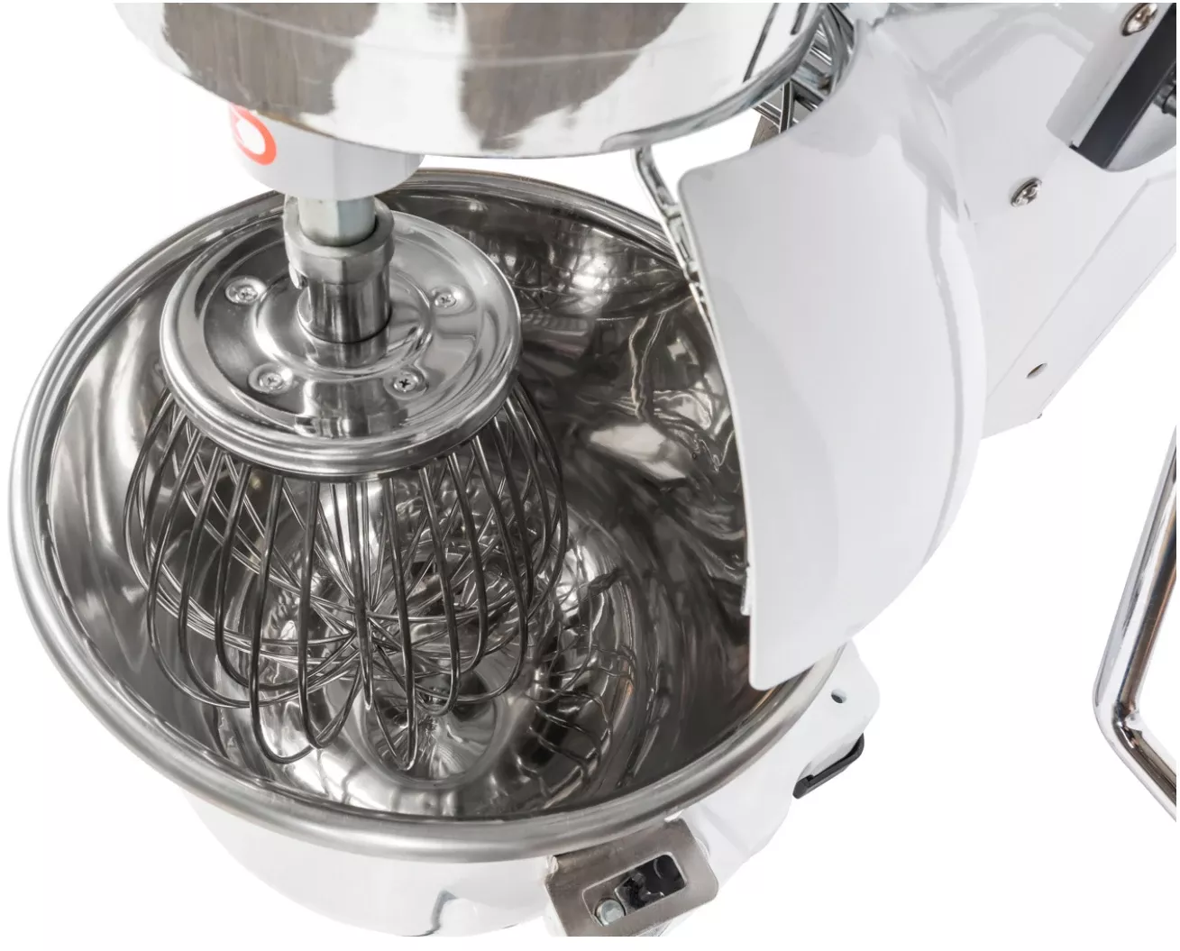 Миксер с установленной дежой из пищевой нержавеющей стали AISI-304.Венчик для взбивания самых различных кремовых масс: заварных, сливочных, белковых, сметанных, творожных и так далее. Также используется для перемешивания желеобразных масс, сиропов, соусов, муссов и «легких» эмульсий.