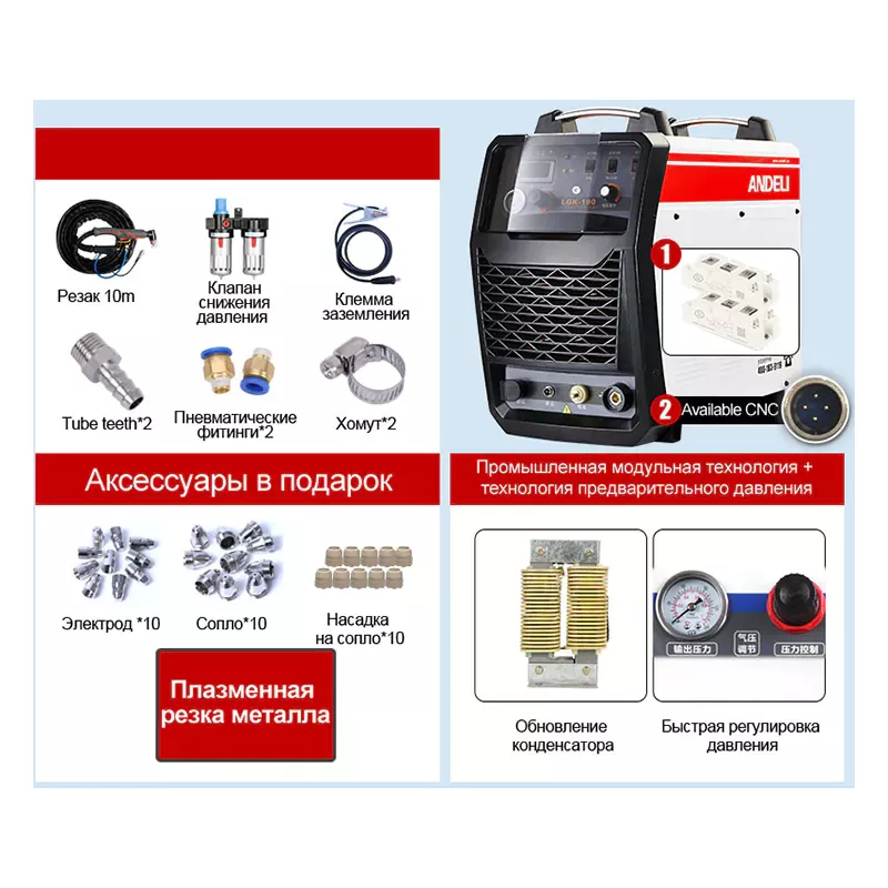 Установка воздушно-плазменной резки ANDELI CUT-100G+ работает от трехфазной сети питания 380 В, что ставит модель в класс промышленного оборудования. Оператору доступна частота тока резки от 30 до 100А.