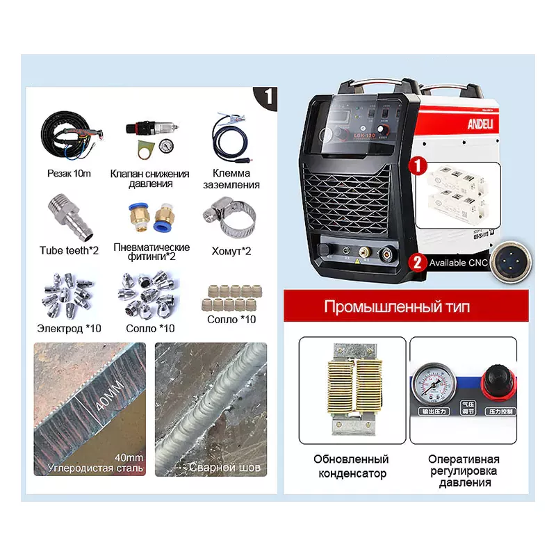 ANDELI CUT-120GL+ является флагманской моделью в классе установок воздушно-плазменной резки. Оператору доступен диапазон рабочего тока от 30 до 120А, что позволяет работать со многими материалами. Высокое качество резки, простота, скорость и возможность качественной перфорации листового металла отмечены многими специалистами.