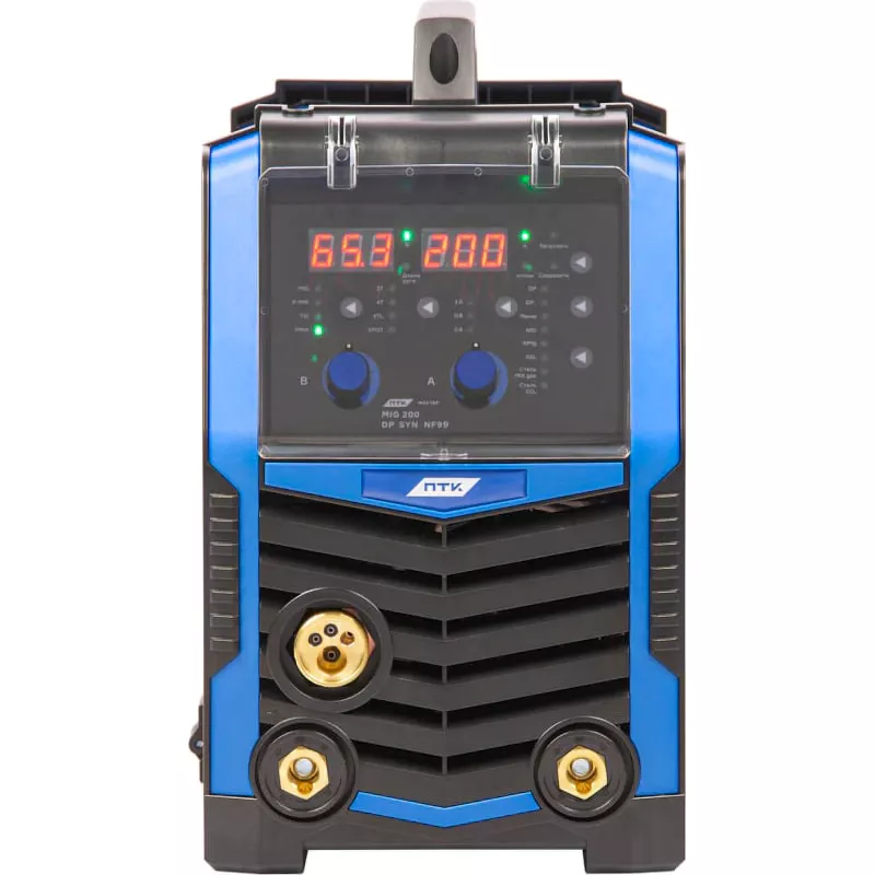 В особом режиме горелки ток и напряжение сварки изменяются согласно заданной циклограмме. Панель управления имеет прозрачную крышку, которая обеспечивает защиту от истирания надписей и внешних воздействий в тяжелых условиях эксплуатации. Применение инверторной технологии в сварочном аппарате ПТК МАСТЕР MIG 200 DP SYN NF99 обеспечивает стабильное напряжение и устойчивость горения дуги.